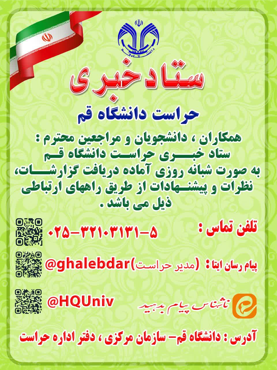 رئیس حراست دانشگاه حسین قالبدار تلفن 32103131-025 داخلی 3131 آیدی ایتا: @ghalebdar |